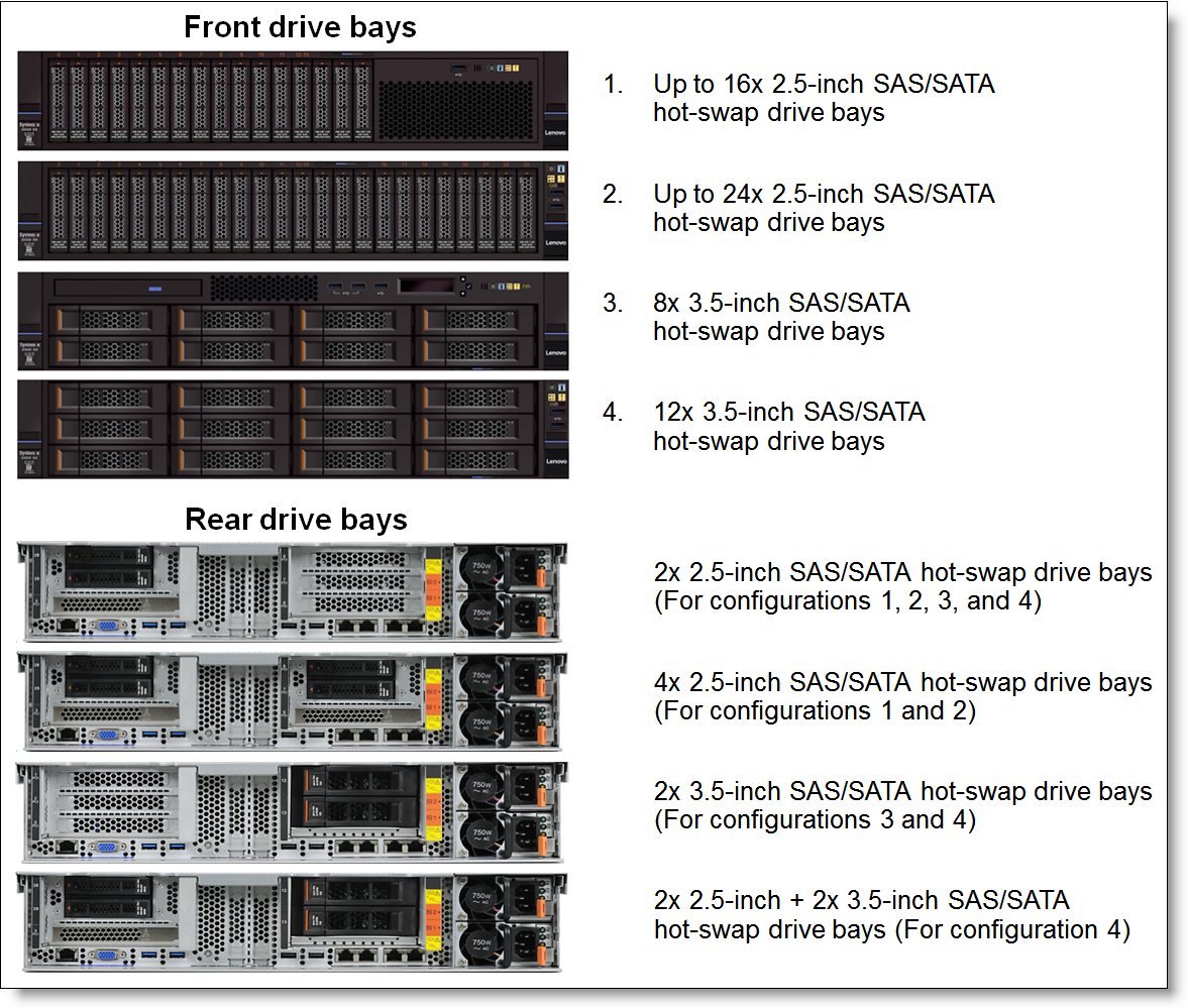 Up to 24 front and 4 rear 2.5-inch HDDs/SSDs; or up to 12 3.5-inch and 2 rear 3.5-inch HDDs + 2 2.5-inch HDDs/SSDs; or up to 8 3.5-inch HDDs and 2 rear 3.5-inch or 2.5-inch HDDs/SSDs; up to 8 2.5-inch NVMe PCIe SSDs on 2.5-inch configurations |